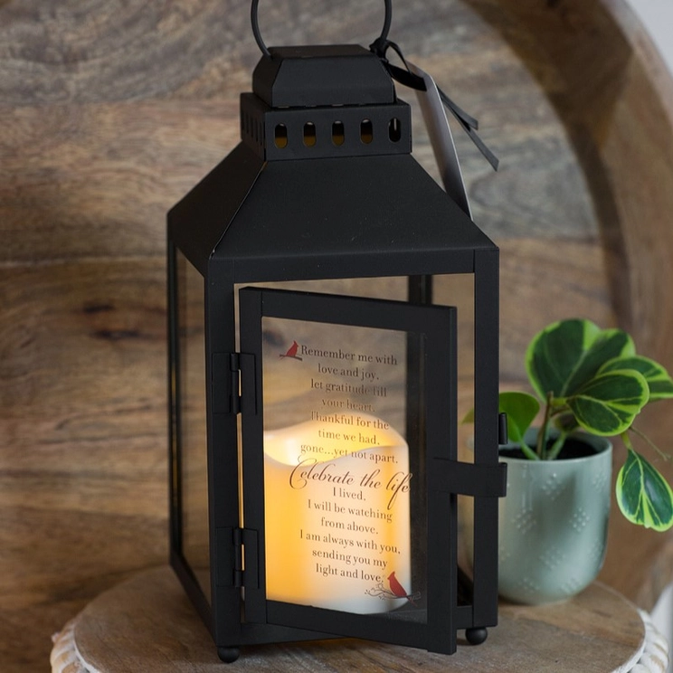 Honor your cherished loved one with our Black Memorial Lantern. Adorned with a heartfelt “Celebration of Life” sentiment and cardinal accent, it offers comfort in times of need. Versatile for indoor or outdoor display, it includes a built-in 3″ flickering warm yellow LED candle (batteries not included). Complete with a memorial gift tag and ribbon, it’s a meaningful gesture of solace and support. Whether on a tabletop or as a centerpiece, this lantern illuminates the enduring love and memories shared.